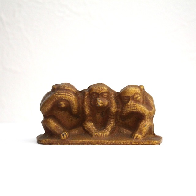重厚感のある三猿です。 ペーパーウェイトの生まれでしょうか。 見ざる、聞かざる、言わざるの順に並んでいます。 背面の愛らしいしっぽにもぜひご注目下さい。 状態: 若干の擦れ。 幅 8.7cm 高さ 4.1cm 奥行 4.1cm 重さ 約451g 鋳鉄 日本 昭和〜平成時代・20〜21世紀 A charming cast iron three wise monkeys in gold color. Iron Japan Showa to Heisei. 20th-21st C Condition : Scuffed. w8.7cm h4.1cm d4.1cm We ship worldwide. Please contact us for overseas shipping.