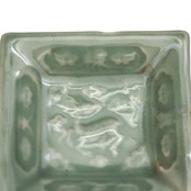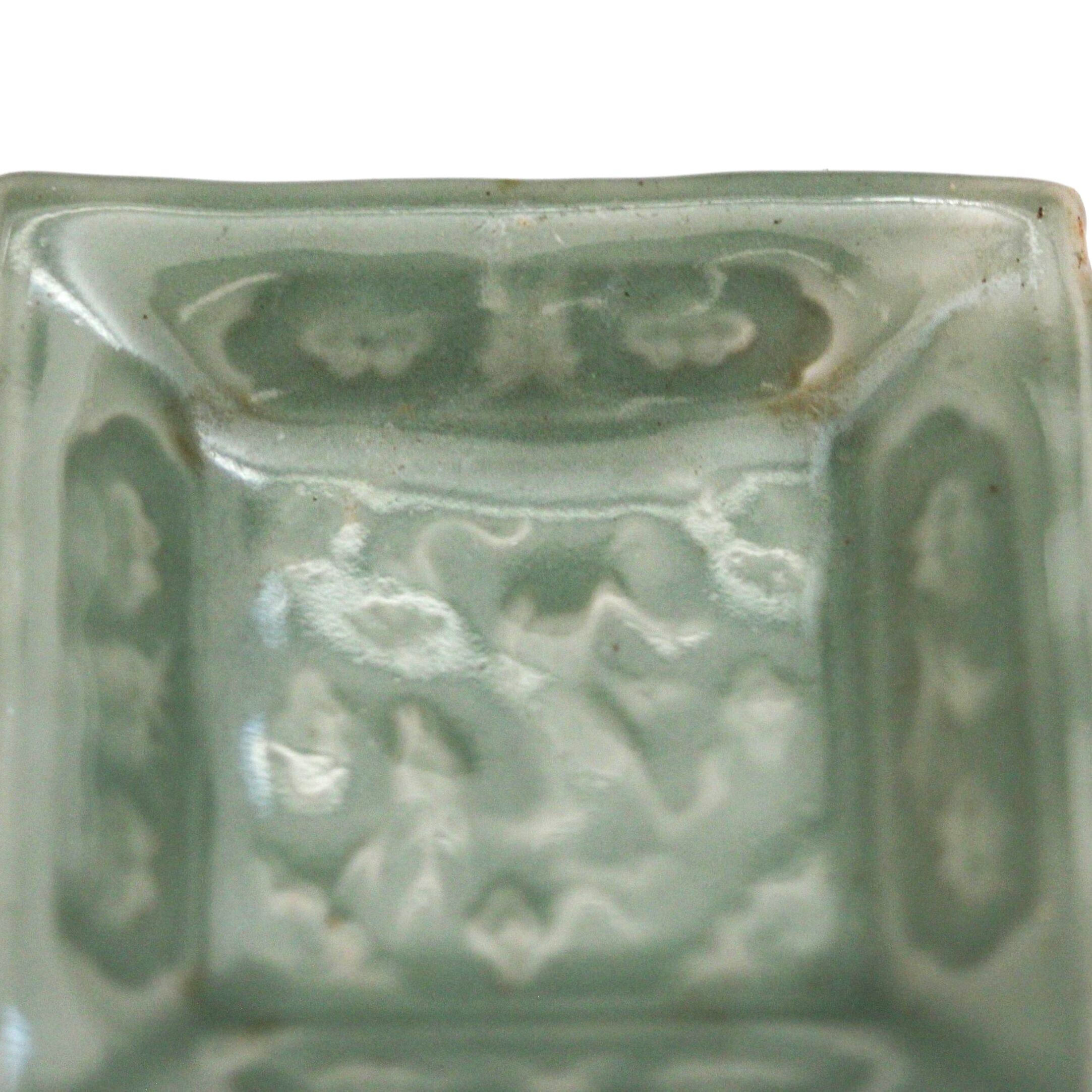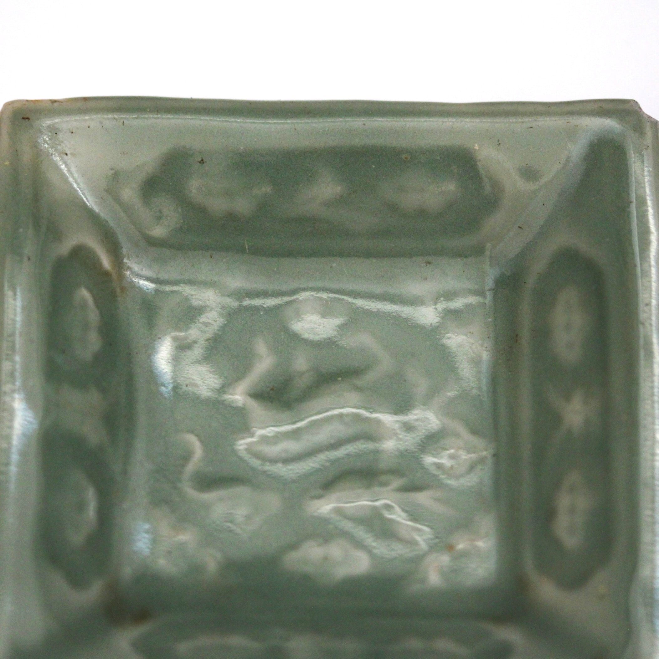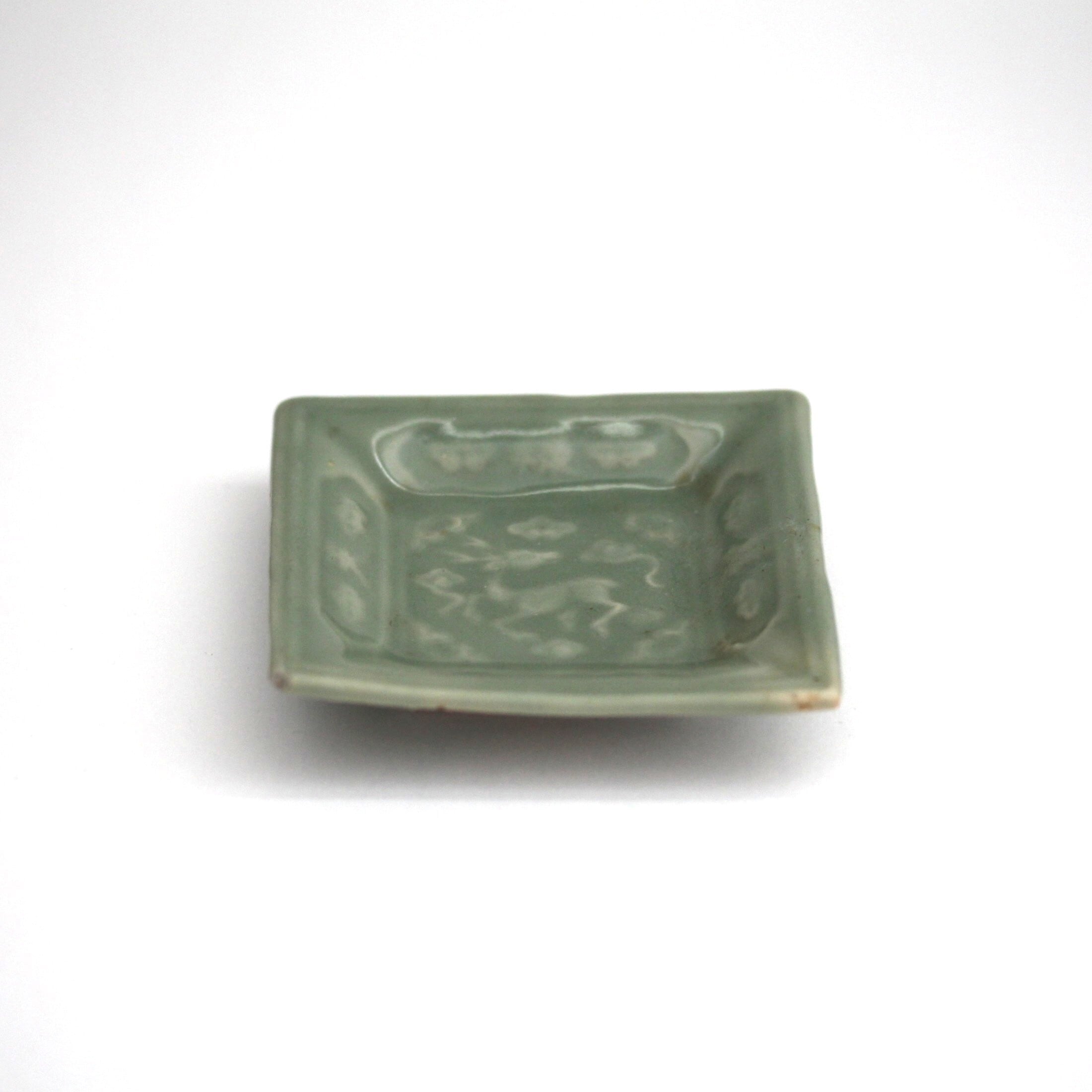A charming celadon square small plate, with embossed design of a deer in the center. Around the deer four Chinese characters are embossed, which mean "Wine is Heaven's boon to man.".