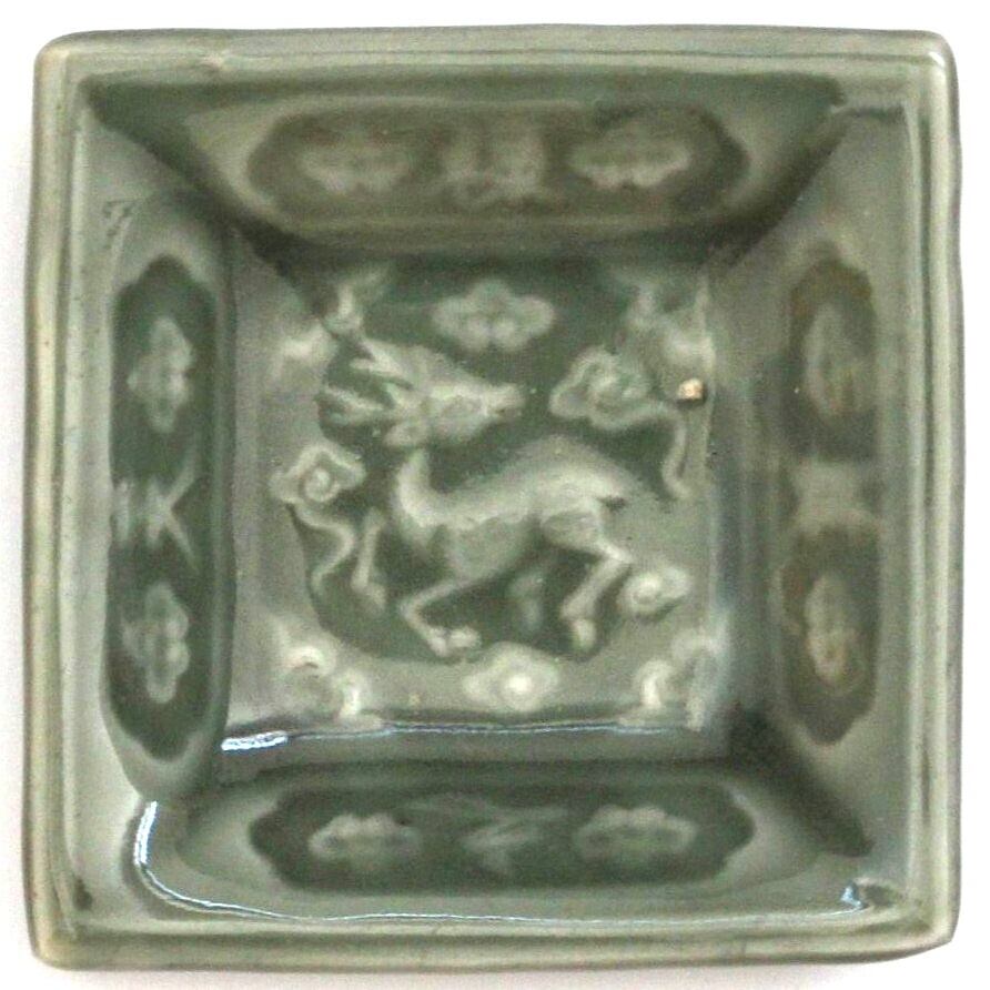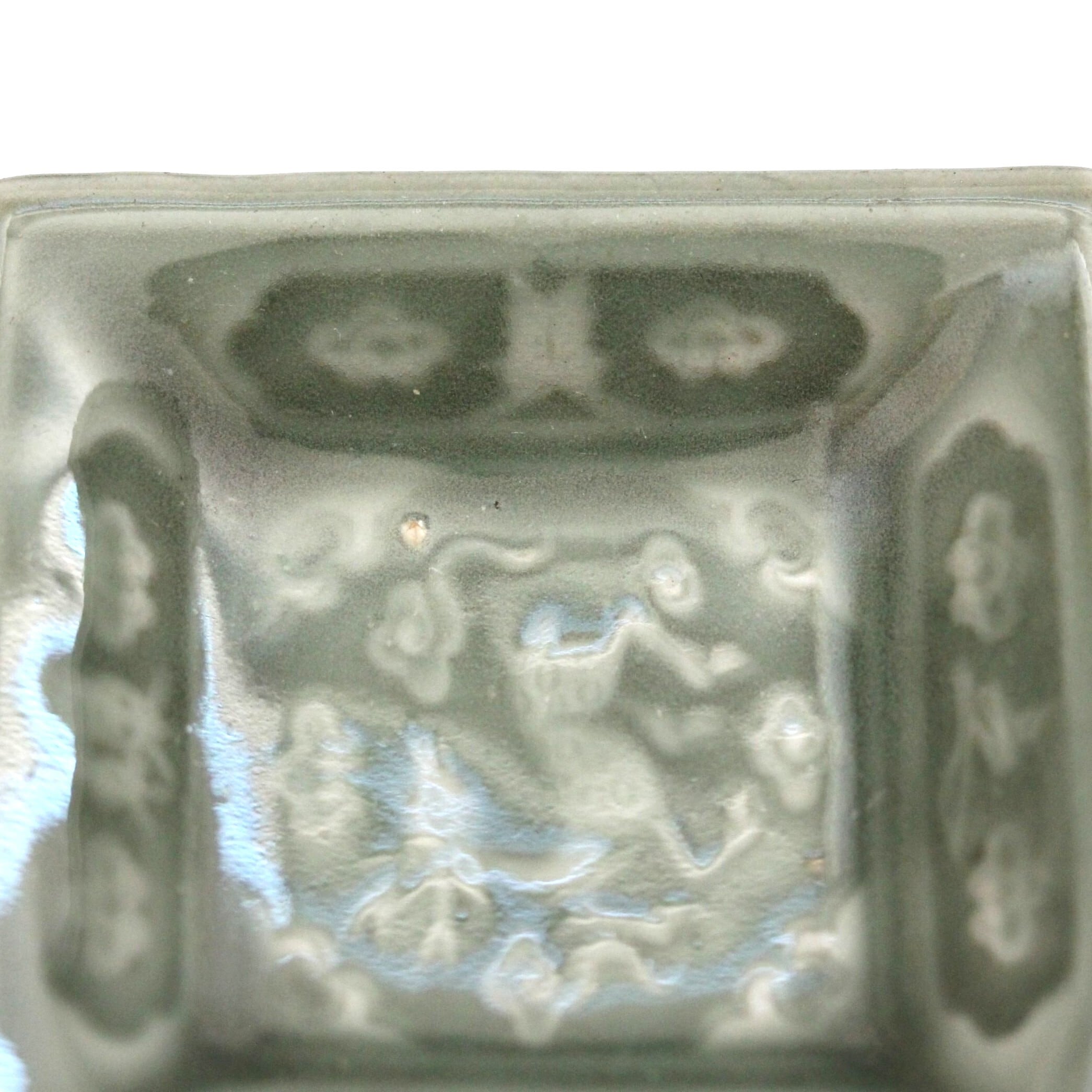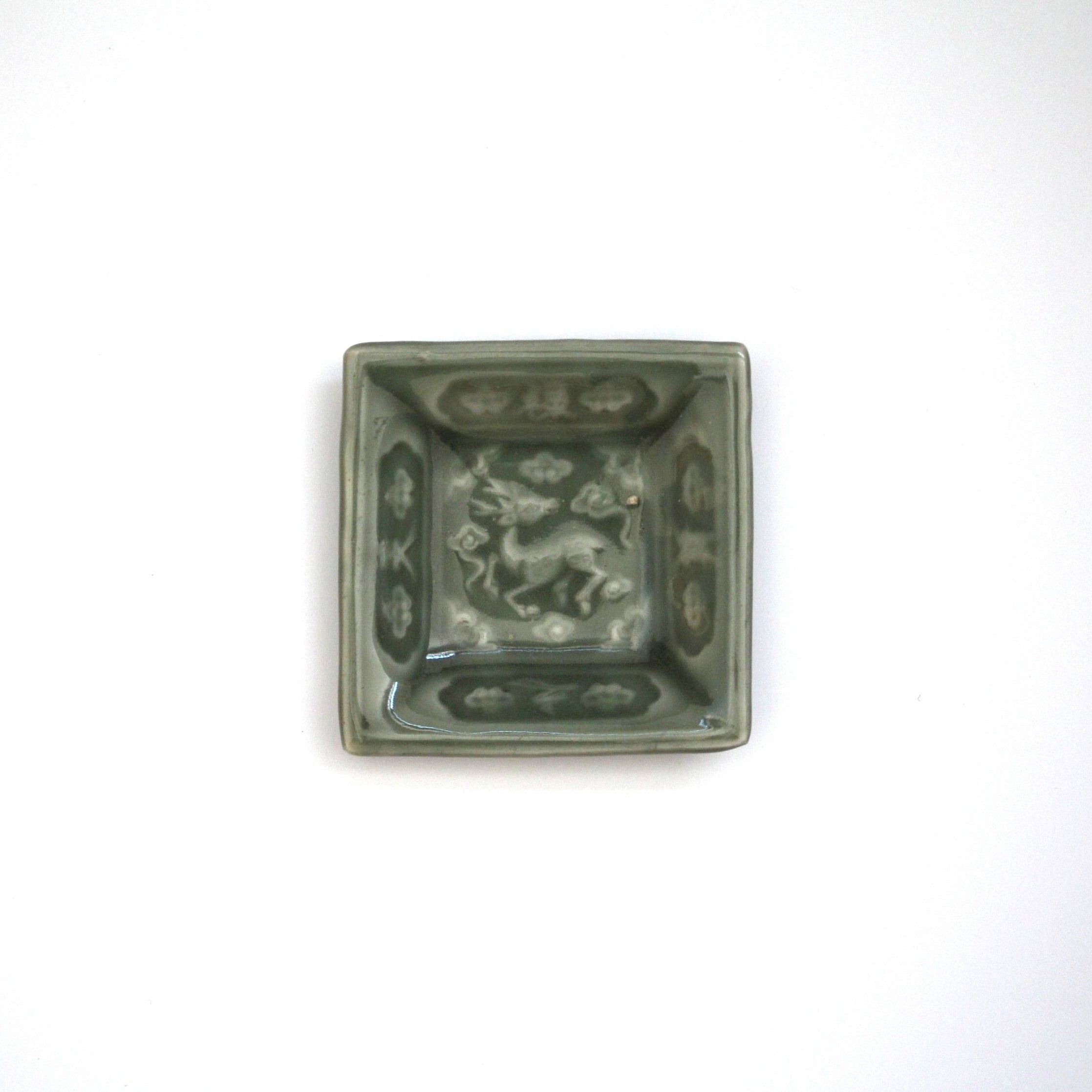 A charming celadon square small plate, with embossed design of a deer in the center. Around the deer four Chinese characters are embossed, which mean "Wine is Heaven's boon to man.".