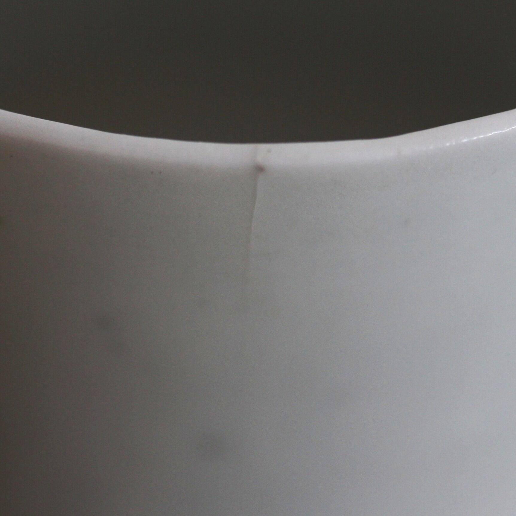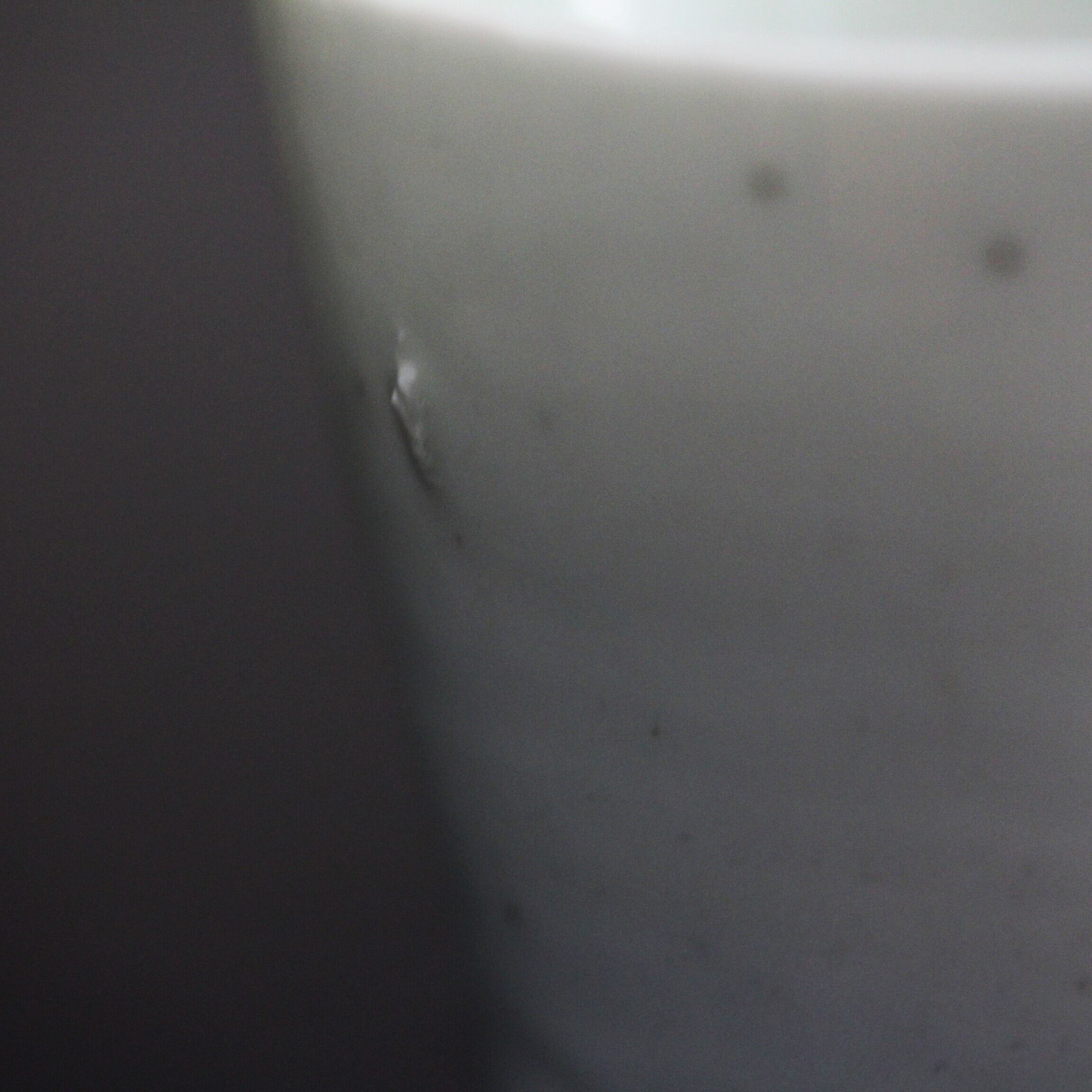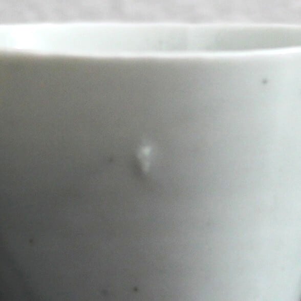 口縁に1か所、よく見ないと見落としてしまうほどうすく短いニュウが生じています。