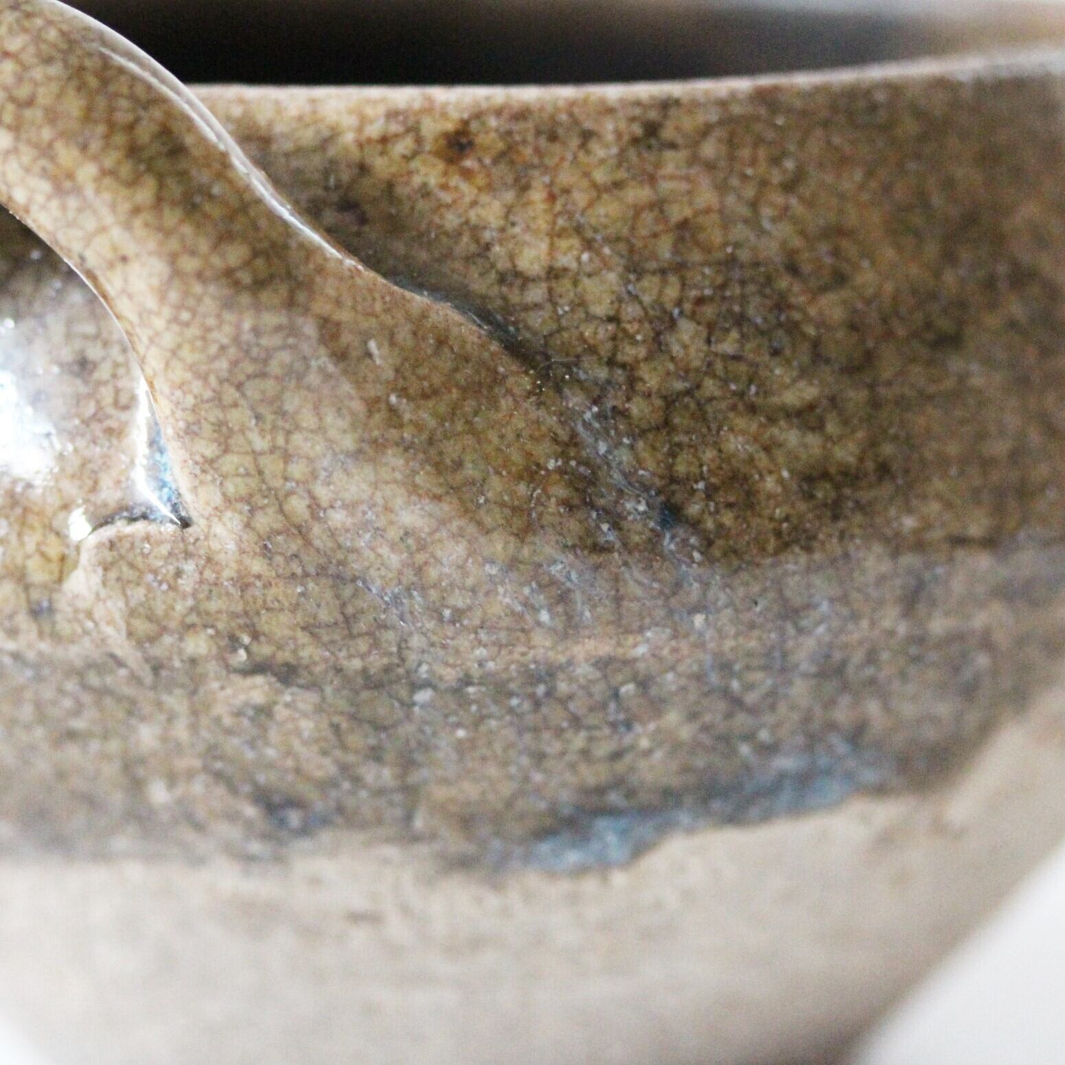 A beautiful straw ash glazed bowl with one handle made in Hoeryong, North Korea.