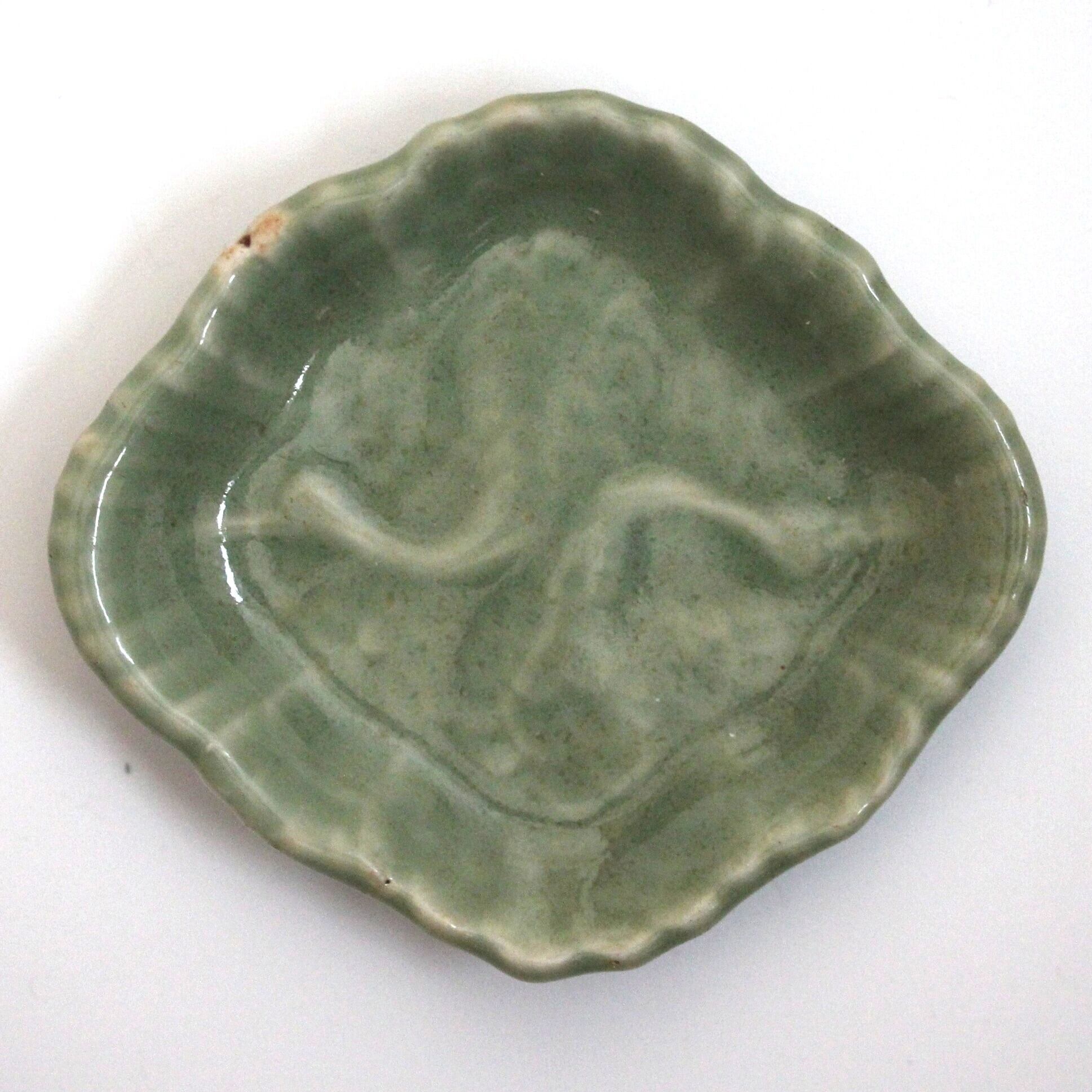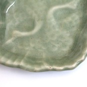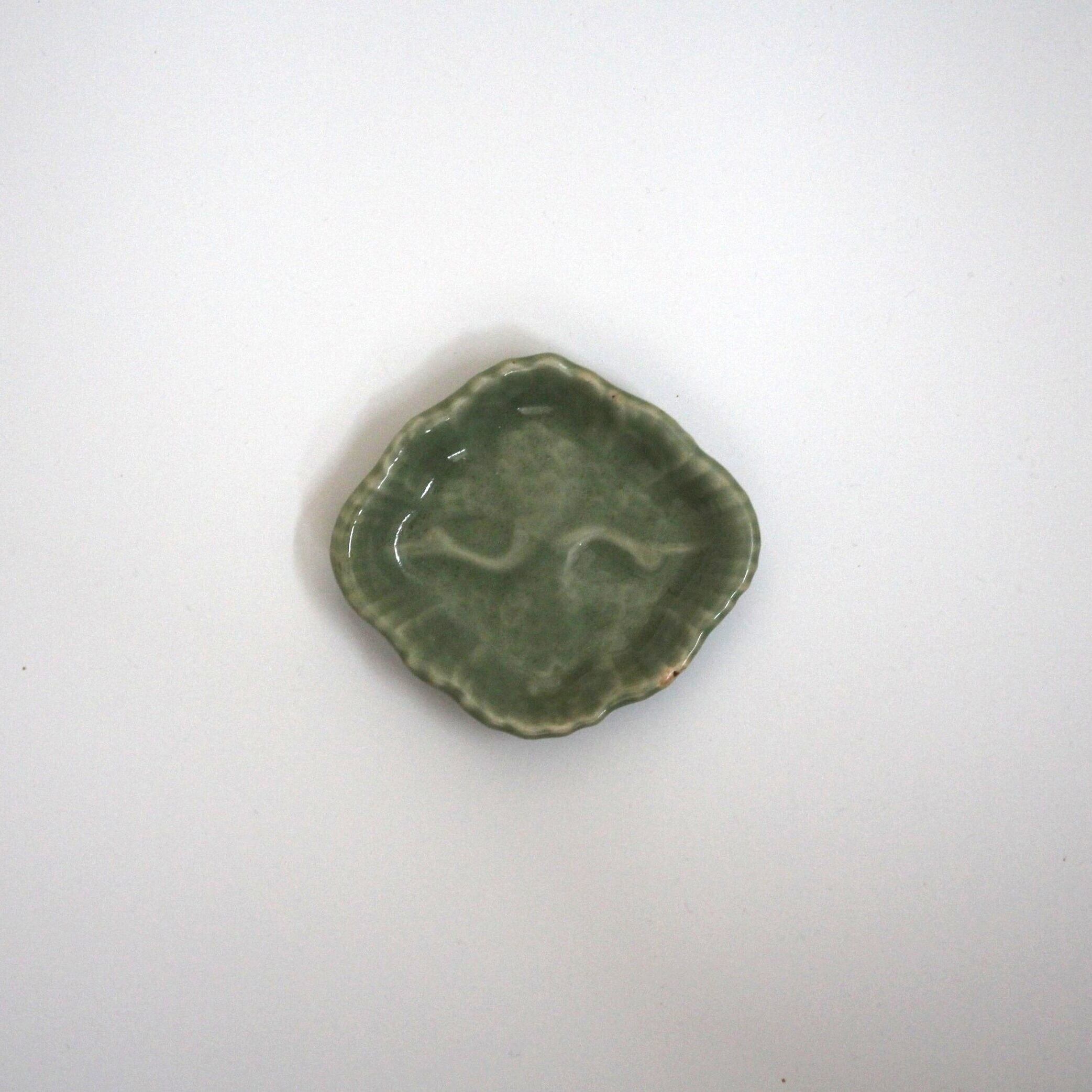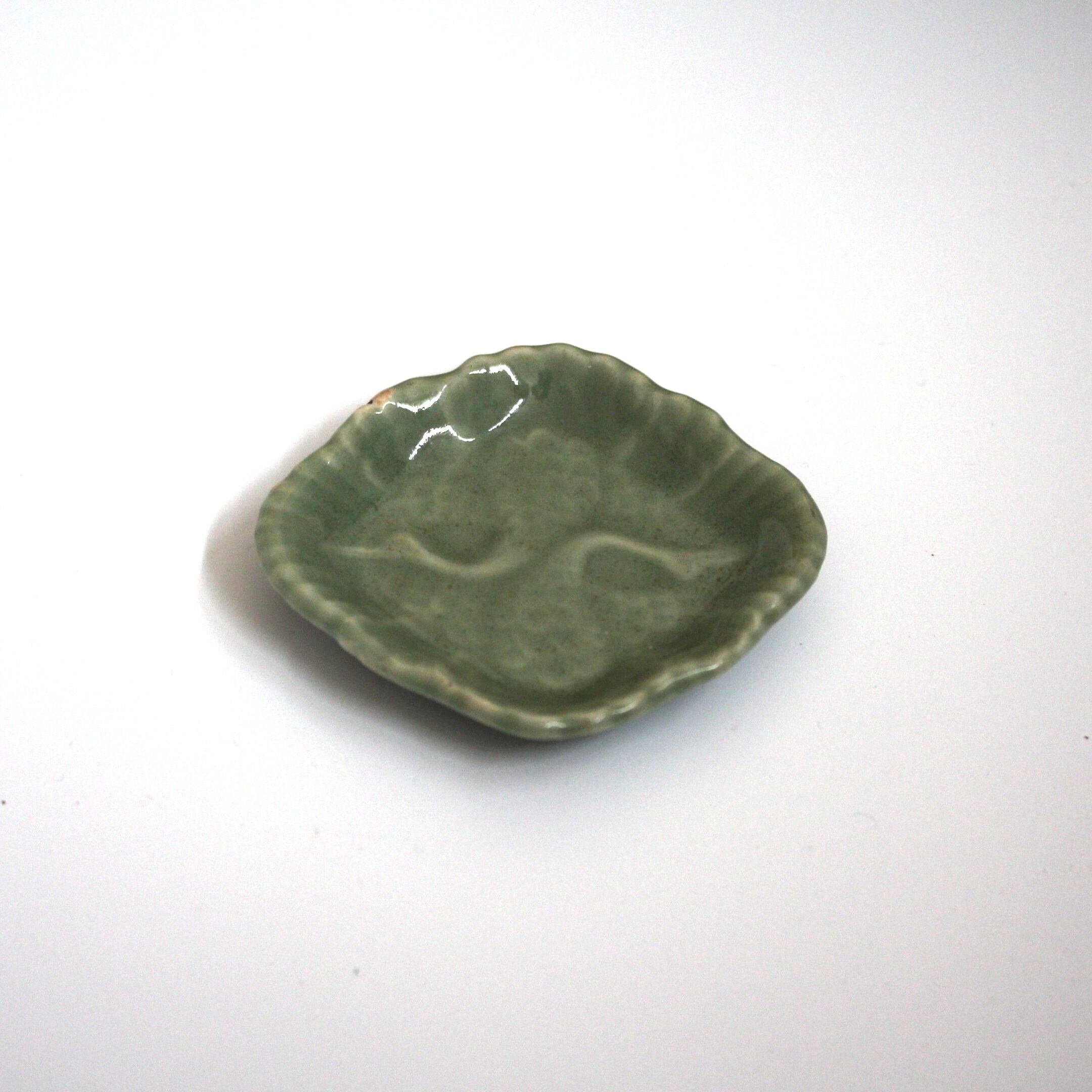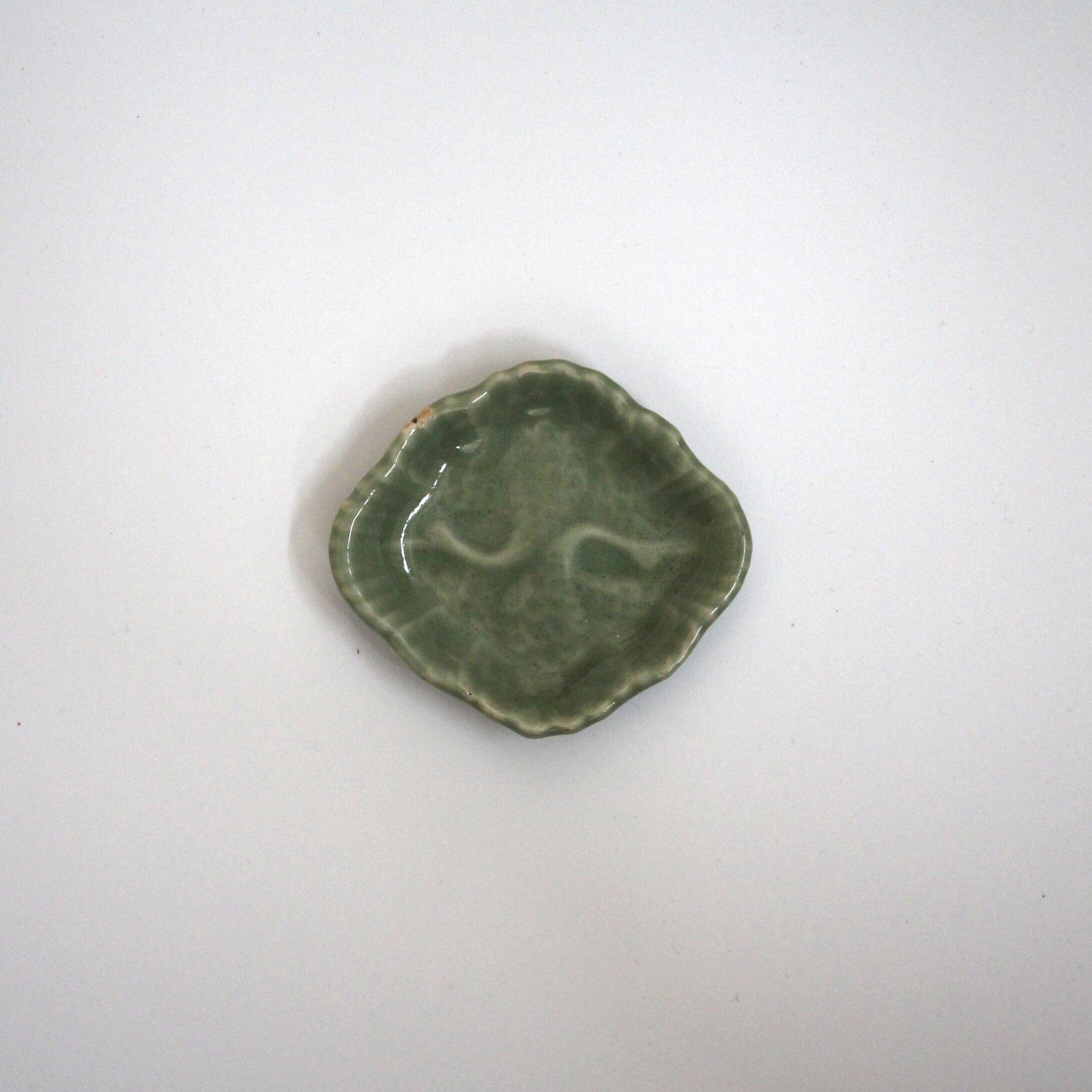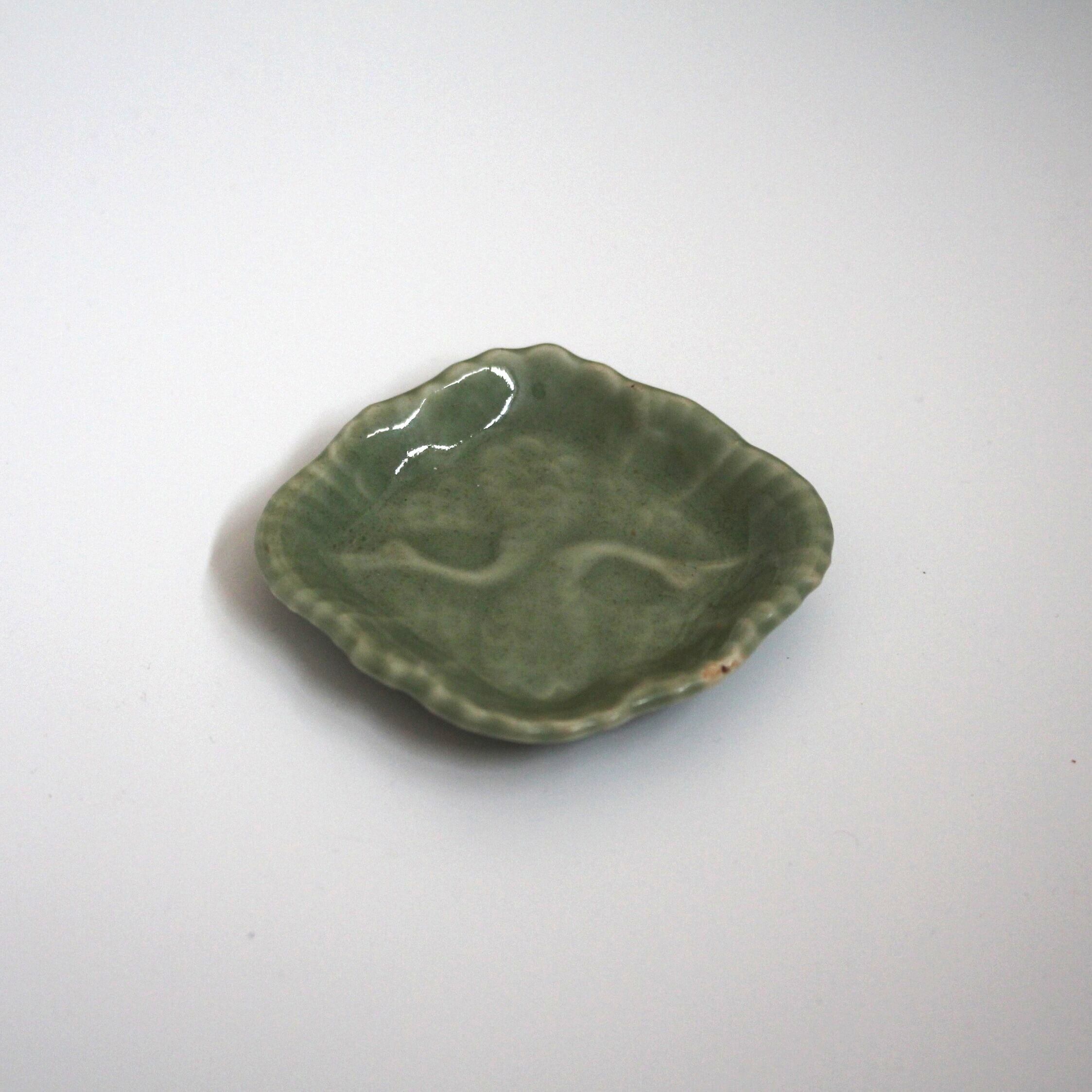 三田青磁の双鶴文の菱形小皿(その5)d9.7cm Antique Japanese Celadon Rhombus Small Dish, Embossed Design of Cranes, Sanda Kiln
