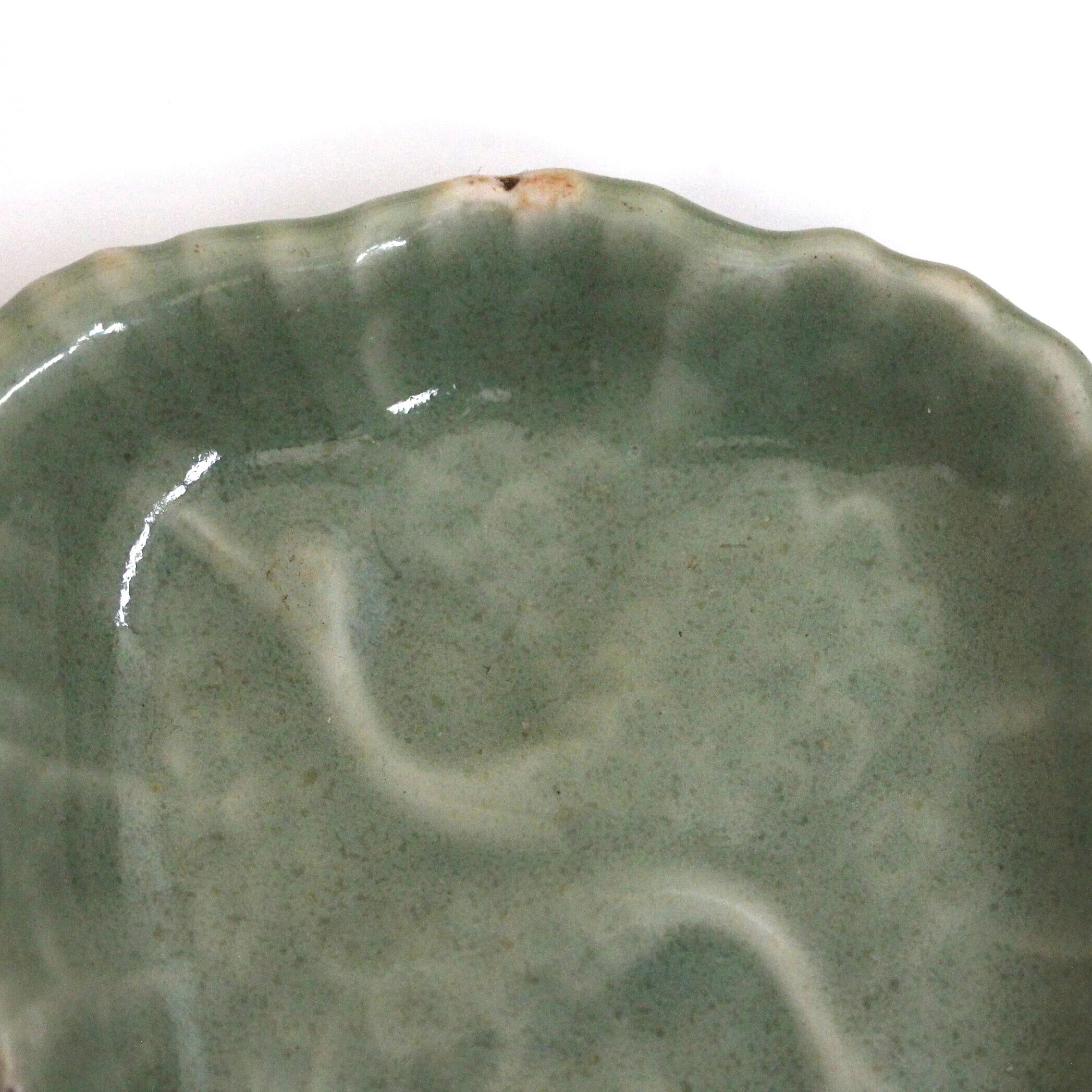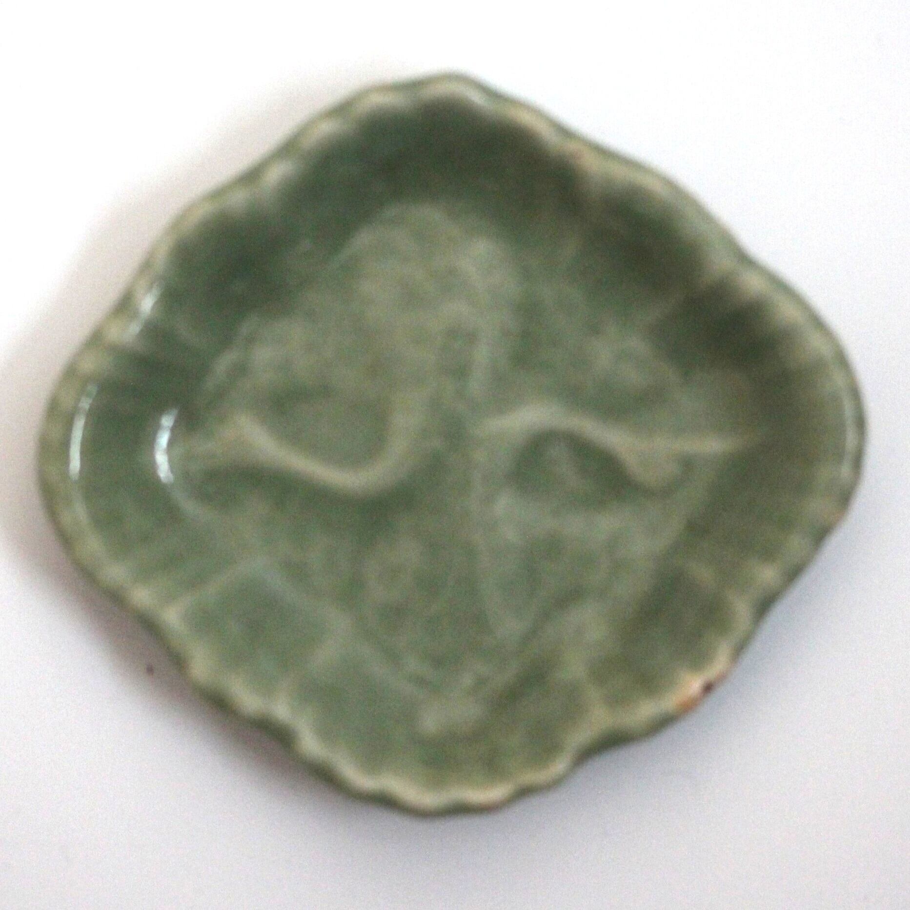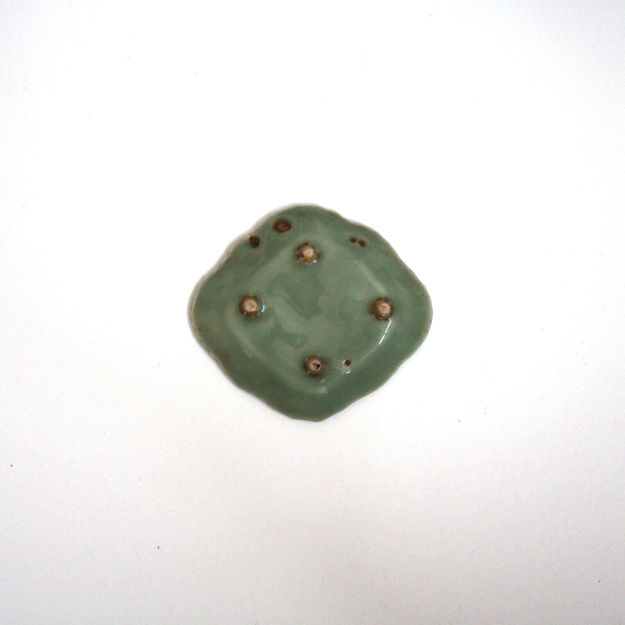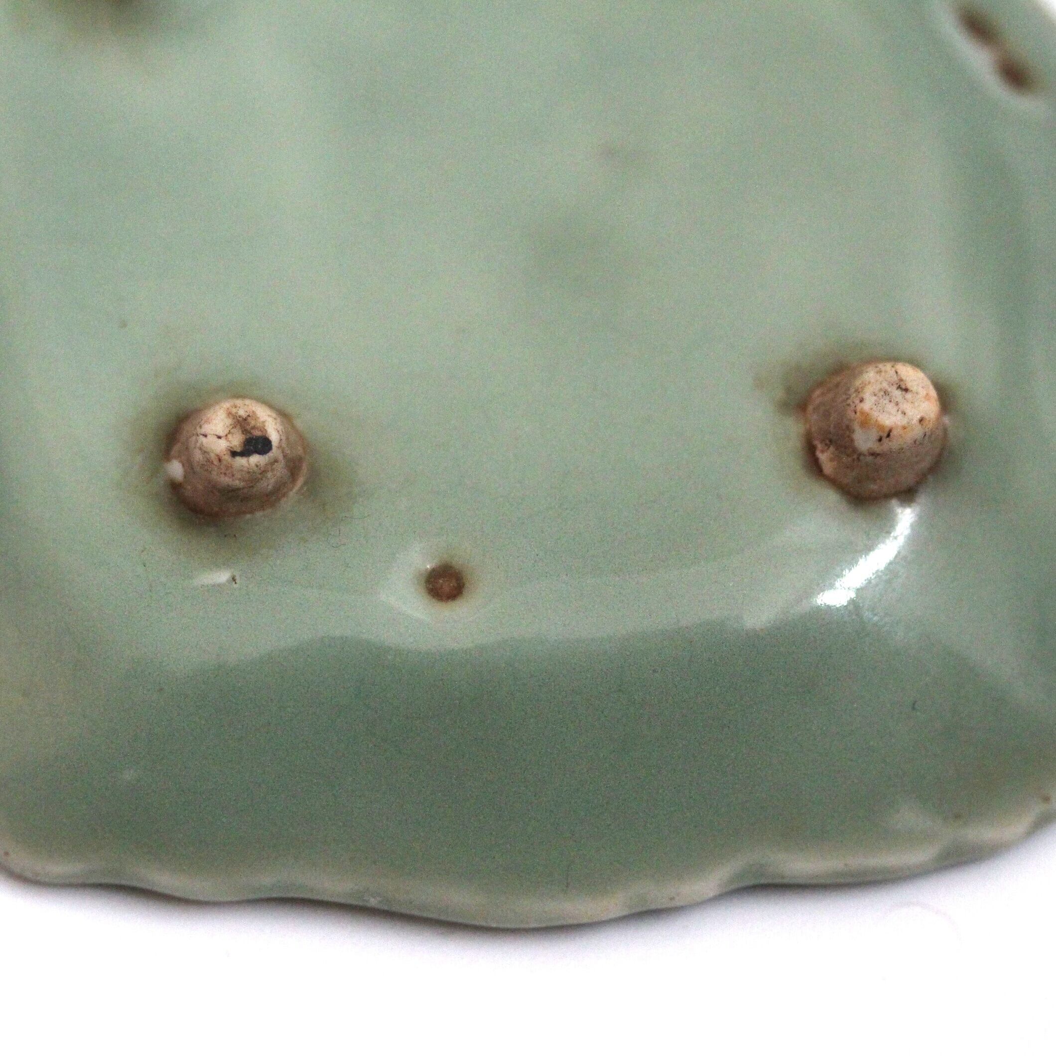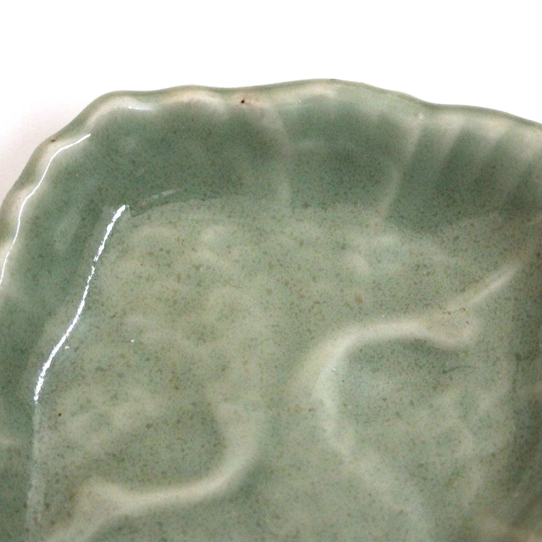 三田青磁の双鶴文の菱形小皿(その5)d9.7cm Antique Japanese Celadon Rhombus Small Dish, Embossed Design of Cranes, Sanda Kiln