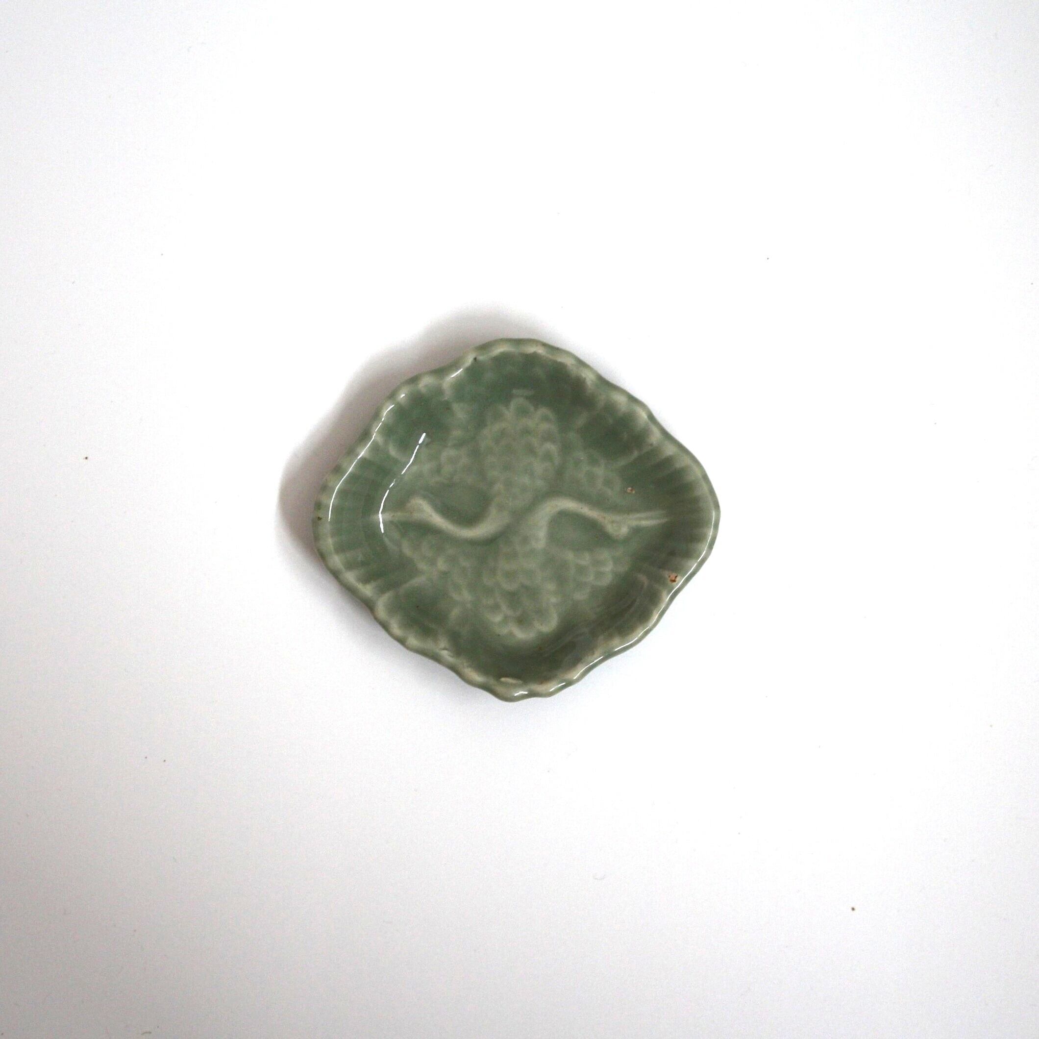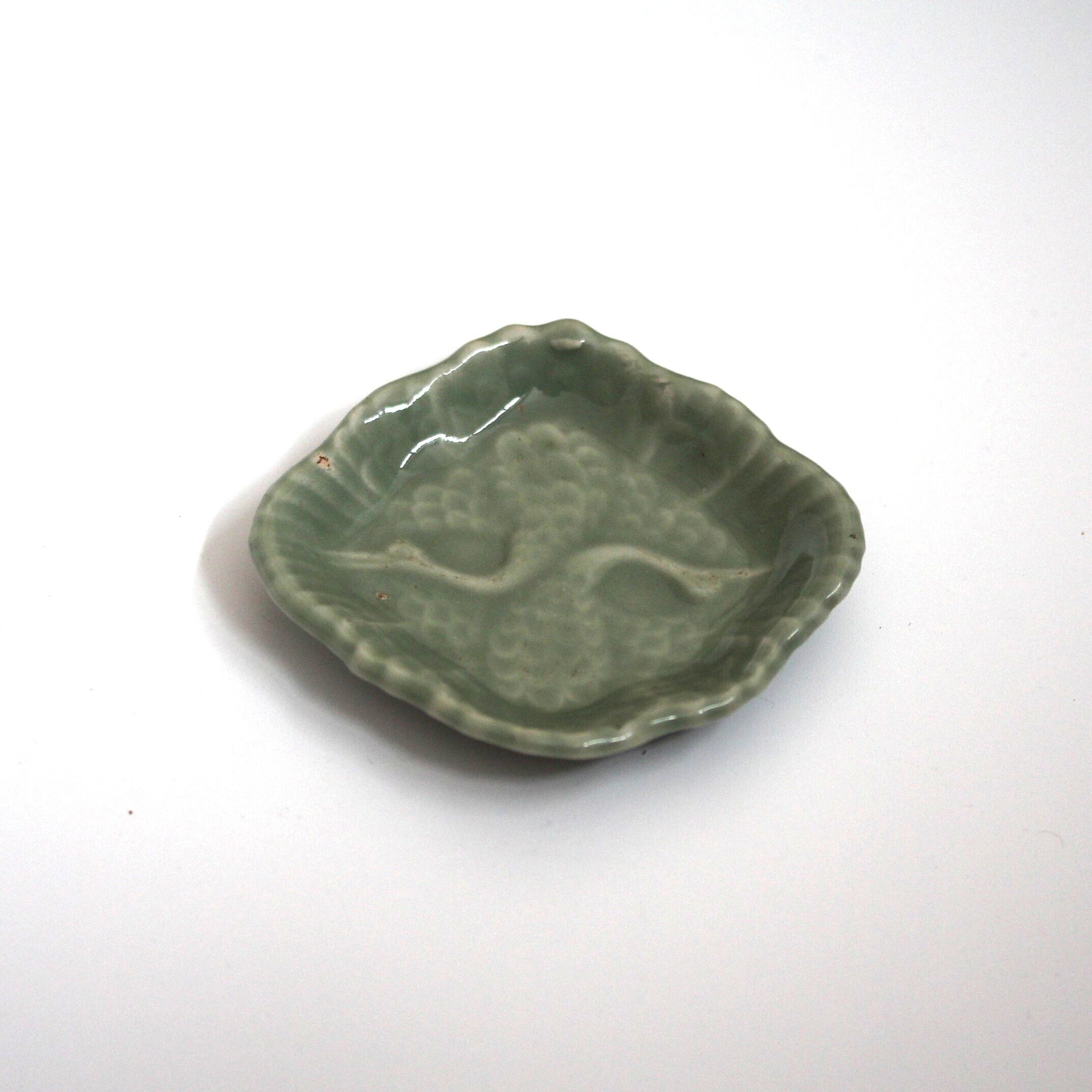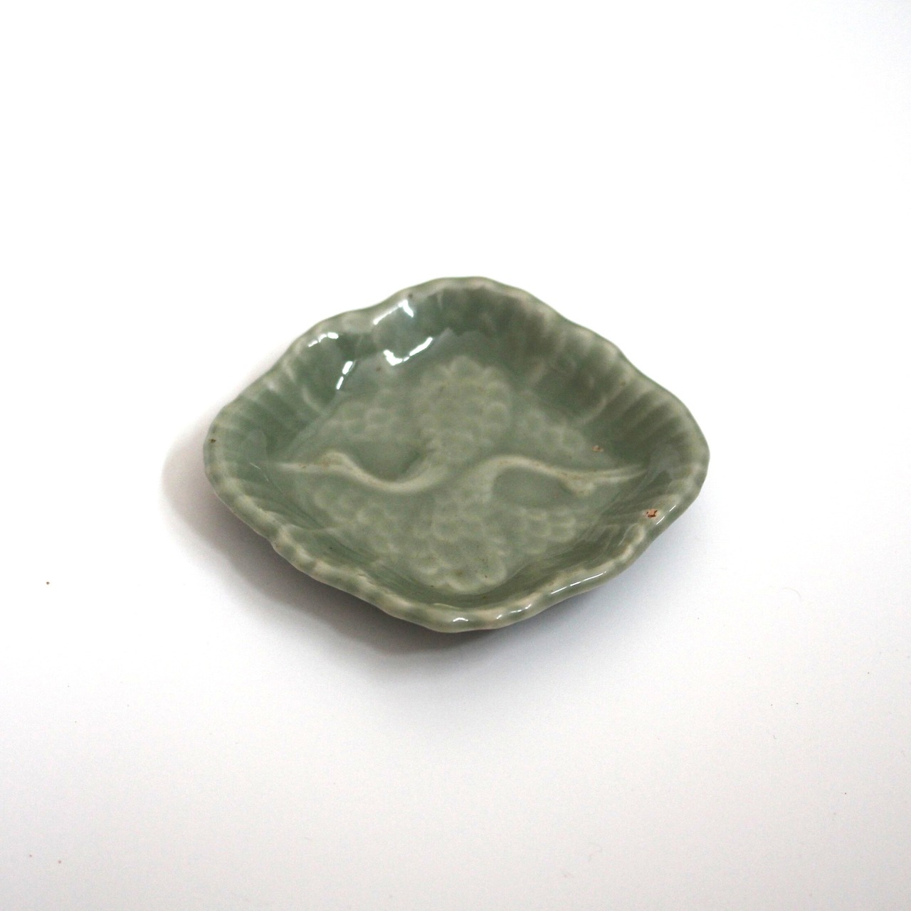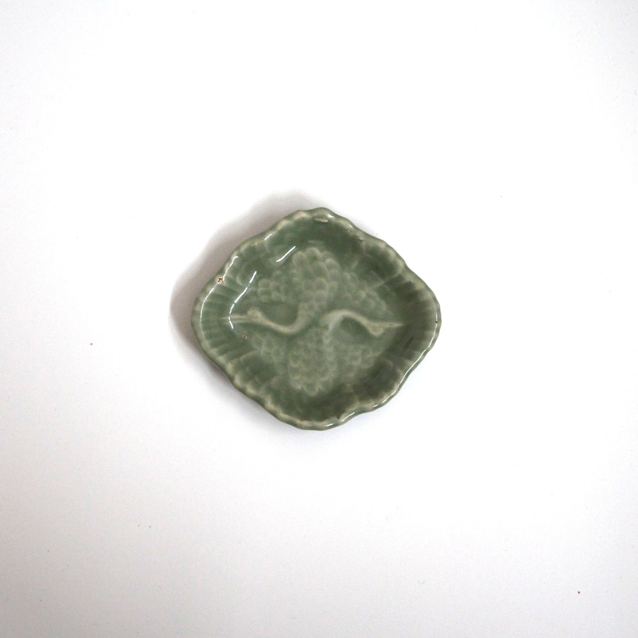 三田青磁の双鶴文の菱形小皿(その4)d9.7cm Antique Japanese Celadon Rhombus Small Dish, Embossed Design of Cranes, Sanda Kiln