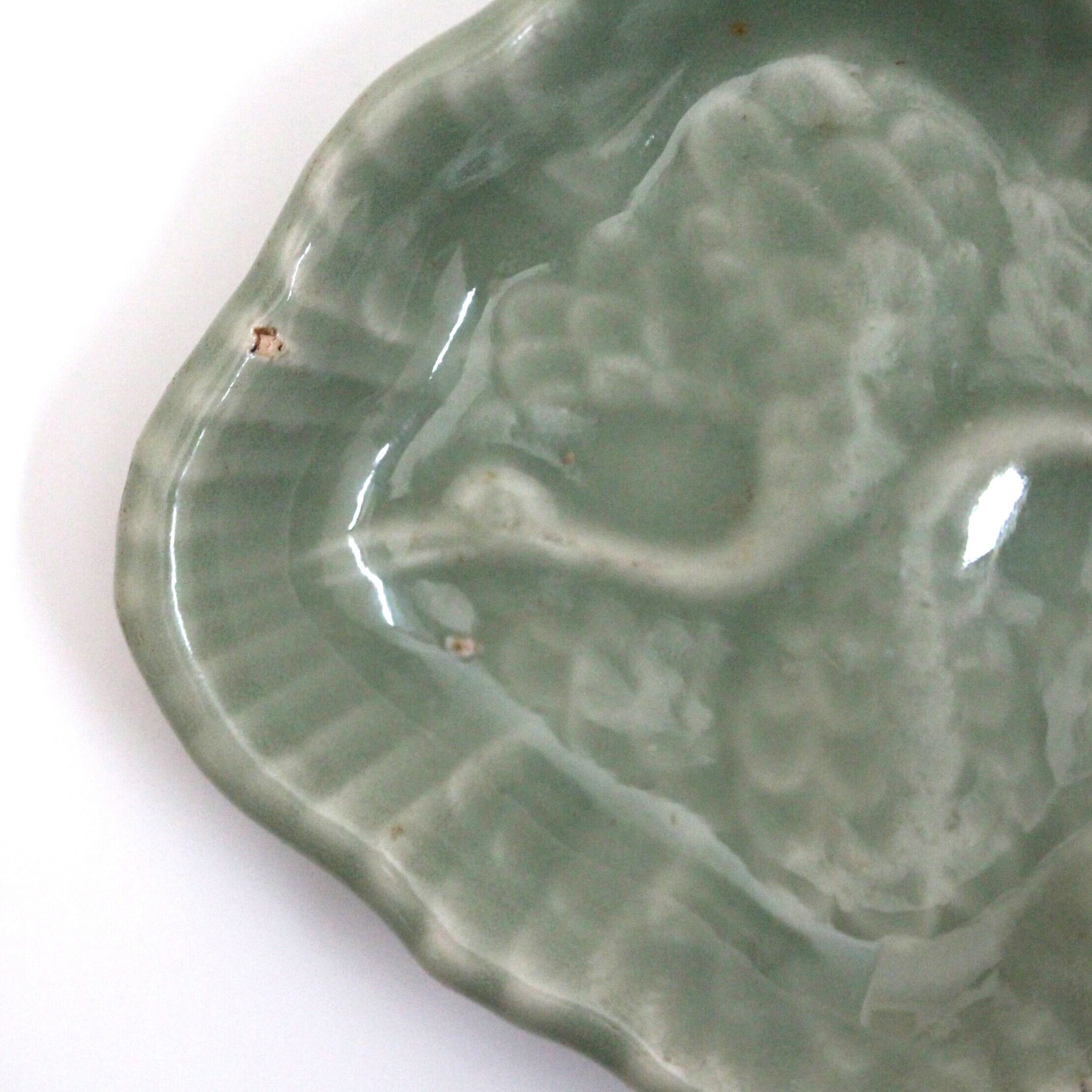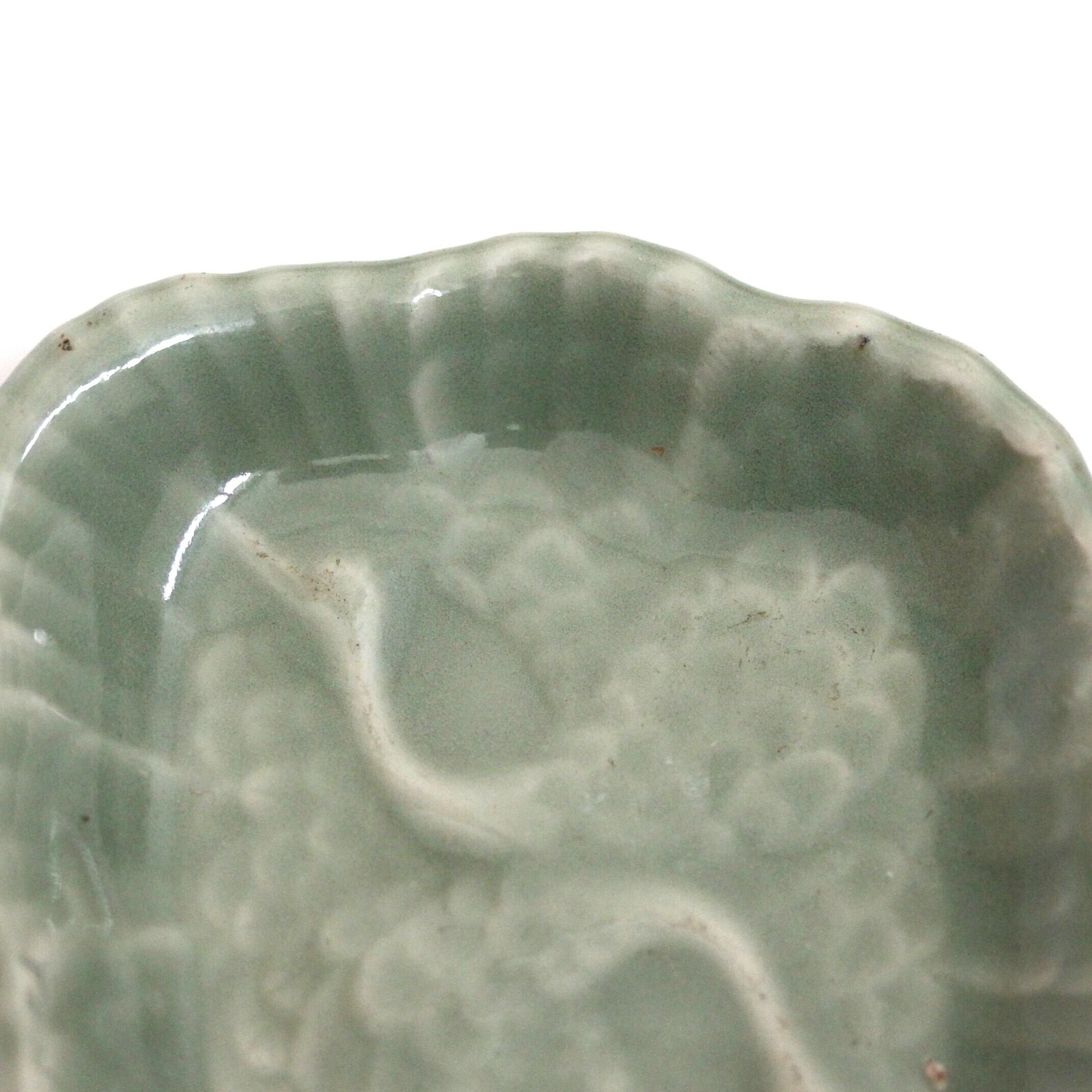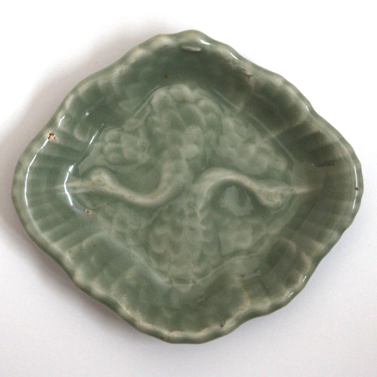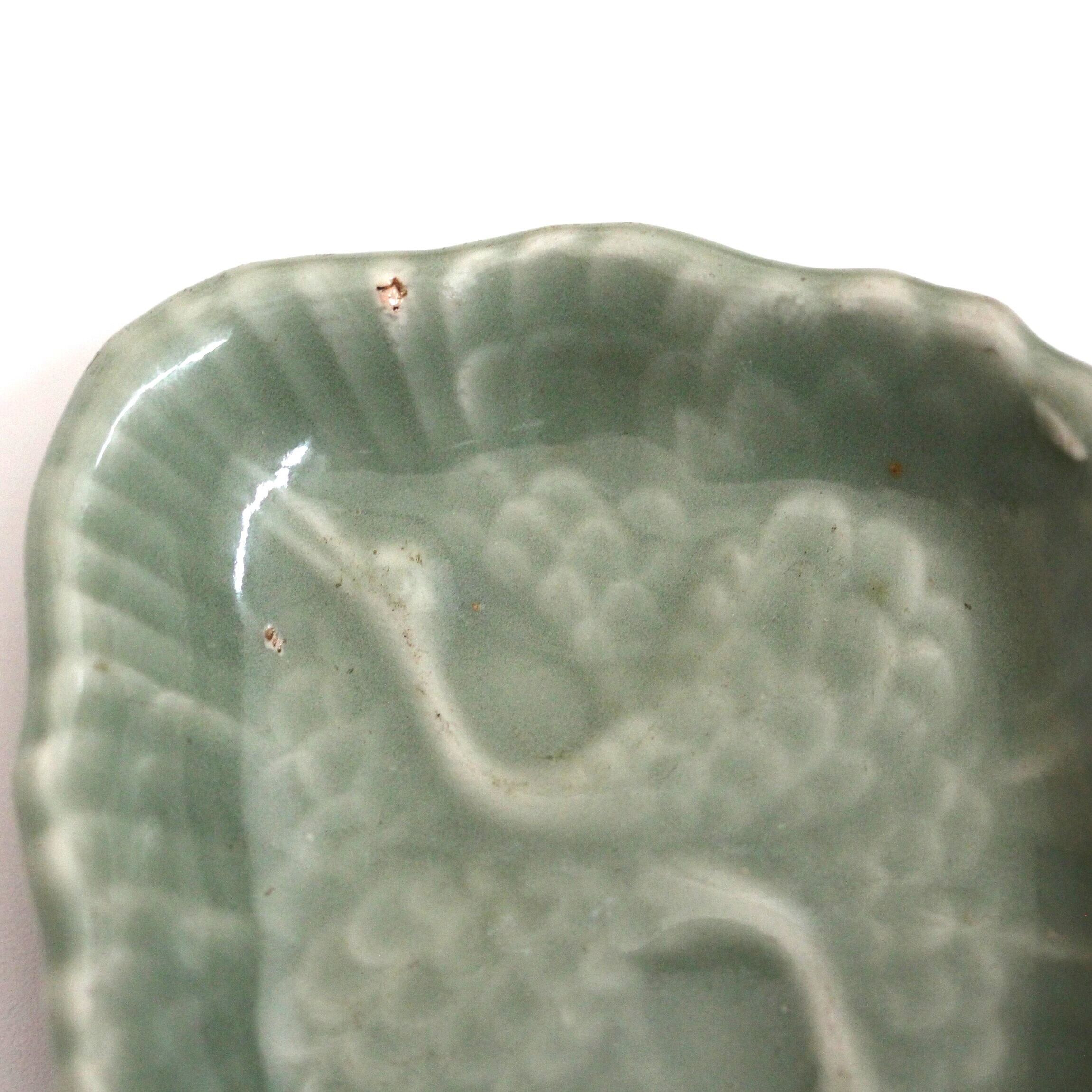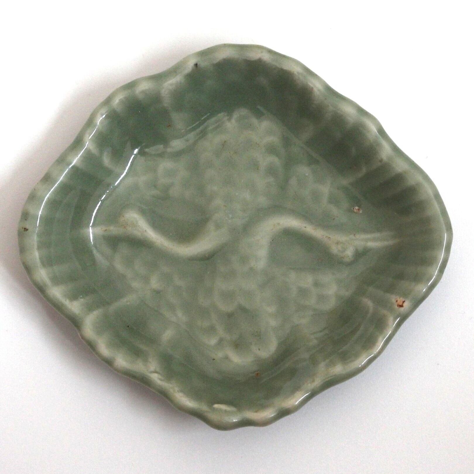 三田青磁の双鶴文の菱形小皿(その4)d9.7cm Antique Japanese Celadon Rhombus Small Dish, Embossed Design of Cranes, Sanda Kiln
