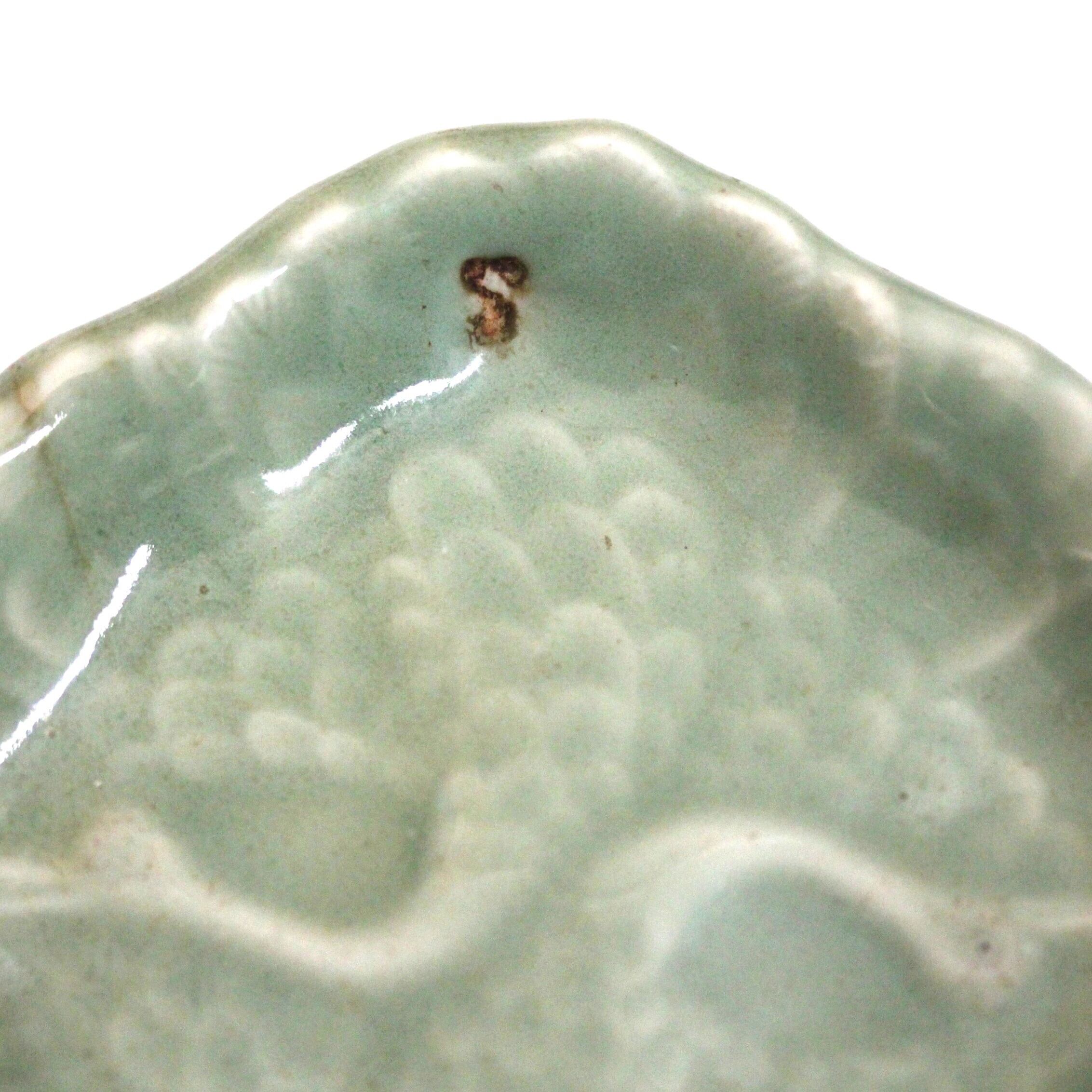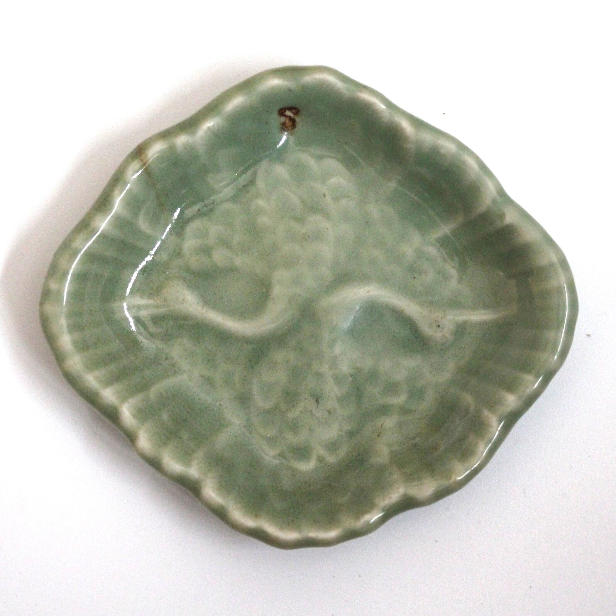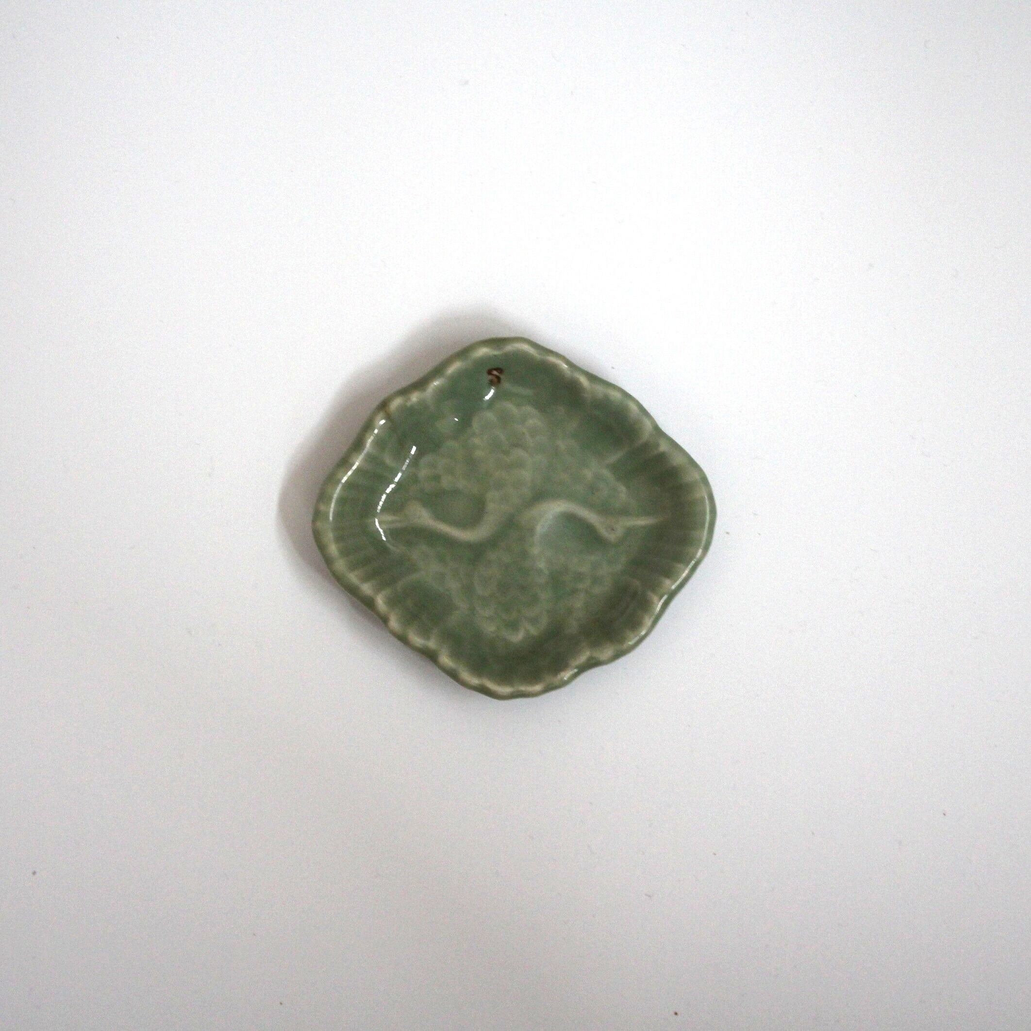 三田青磁の双鶴文の菱形小皿(その6)d9.7cm Antique Japanese Celadon Rhombus Small Dish, Embossed Design of Cranes, Sanda Kiln | monotone